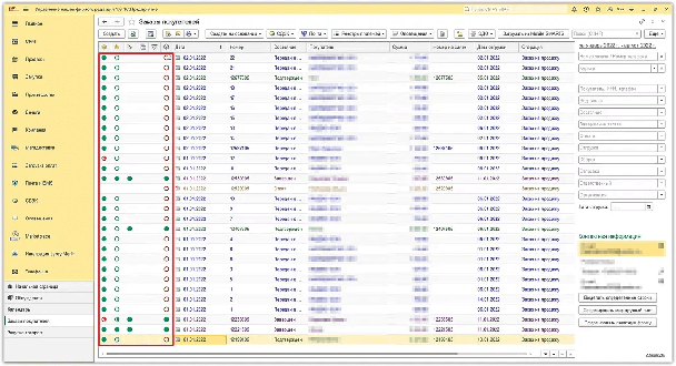 Все заказы попадают в базу 1С, независимо от того, где они были оформлены – на маркетплейсе или в интернет-магазине. Сотрудник «Удачного Сезона» получает их в виде списка в одном окне. Он передаёт заказы на склад для сборки, а статус каждого из них отслеживает с помощью цветовых индикаторов на всех этапах. Зеленый цвет в учётной системе означает, что заказ собран на складе, упакован и передан в доставку.